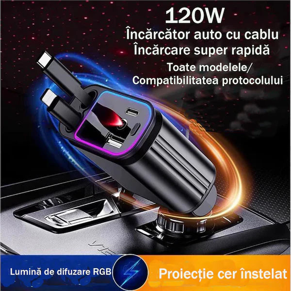 Incarcator auto retractabil 4-in-1 Fast Charge, 2 cabluri retractabile lightning & type-C, Iluminare RGB, proiectie stelara laser