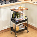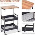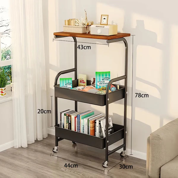 Blat Superior din Lemn: Nivelul superior este prevăzut cu un blat elegant, cu aspect de lemn, ideal pentru a servi cafeaua, gustările sau ca suprafață de lucru suplimentară. Poate susține farfurii, cești sau chiar un tocător mic, așa cum se vede în imagine.